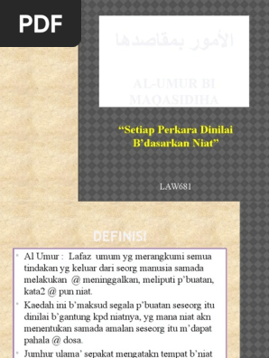 اهدصاقمب روأملا SEGALA PERKARA ITU BERGANTUNG PADA NIAT AT AU TUJUANNYA. Maka kita dapat membuat konklusi bahawa kaedah al-Umur bi Maqasidiha merupakan salah satu cabang utama dalam kaedah fiqh walaupun negara-negara Islam mempunyai penerapan hukum Islam yang tidak sama antara satu sama lain. All matters are connected to the intentions behind them.