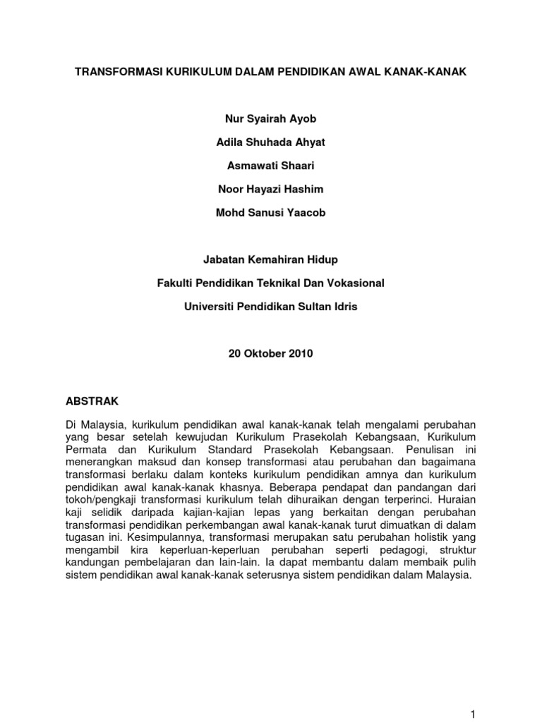 Transformasi Kurikulum Dalam Pendidikan Awal Kanak Kanak Pdf
