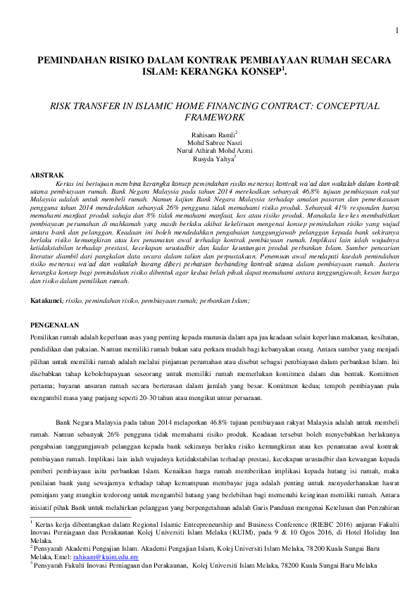 Pdf Pemindahan Risiko Dalam Kontrak Pembiayaan Rumah Secara Islam Kerangka Konsep Mohd Sabree Nasri Academia Edu